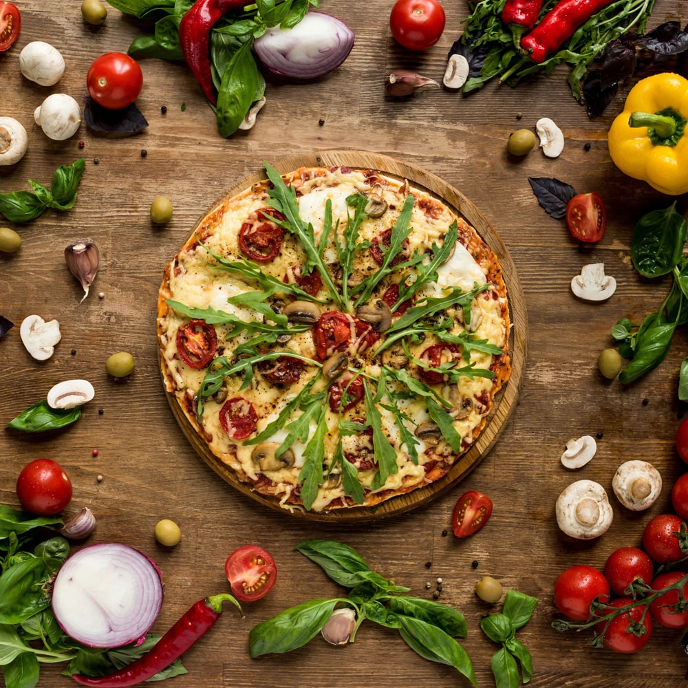 Crispy crust with rich sauce and melted cheese, topped with fresh veggies for perfect flavor